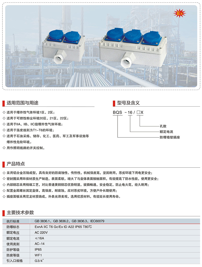 BQS-16系列防爆墙壁插座(IIC、Ex tD)